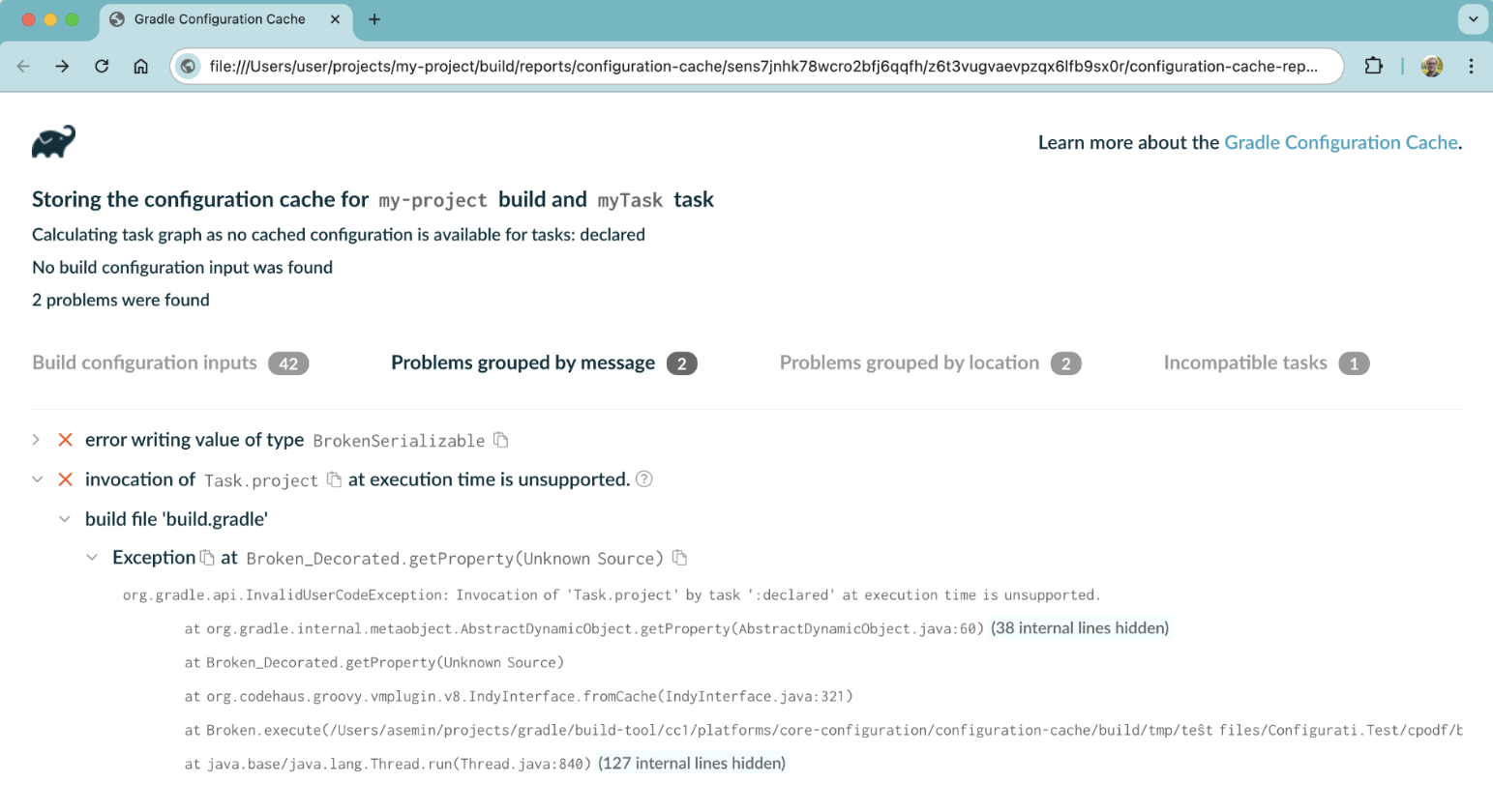 If any problem is found caching or reusing the configuration, an HTML report is generated to help you diagnose and fix the issues. The report also shows detected build configuration inputs like system properties, environment variables and value suppliers read during the configuration phase.